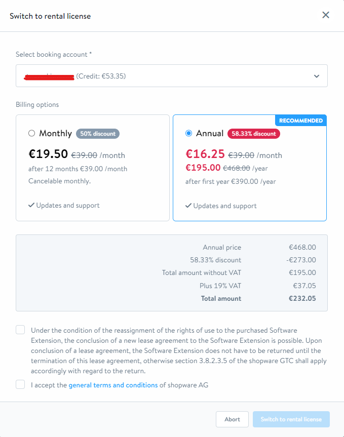 Seit dem ist ausschließlich eine **monatliche und jährliche Mietoption** im Store verfügbar. Dies bedeutet, dass die Kaufoption und die dazugehörige [Erweiterungs-Subscription](https://store.shopware.com/kaufversion-subscriptions) abgeschafft wurde. Dadurch werden die Folgekosten von Erweiterungen transparenter.