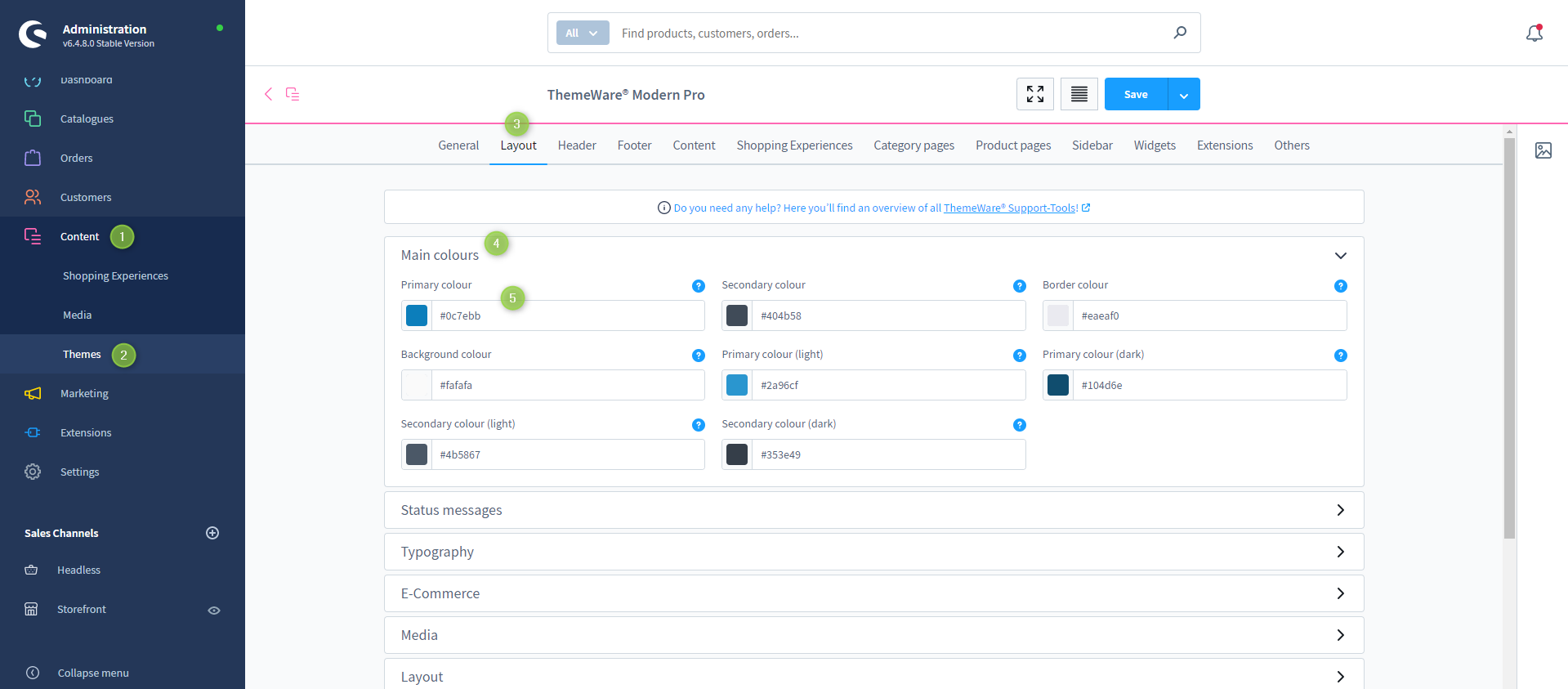 Nachfolgend zeigen wir dir wie du die Hauptfarben in der Theme-Konfiguration an deine Wünsche anpassen kannst, stellen dir das Farbkonfigurationsfeld vor und zeigen dir mögliche Konfigurationswerte.