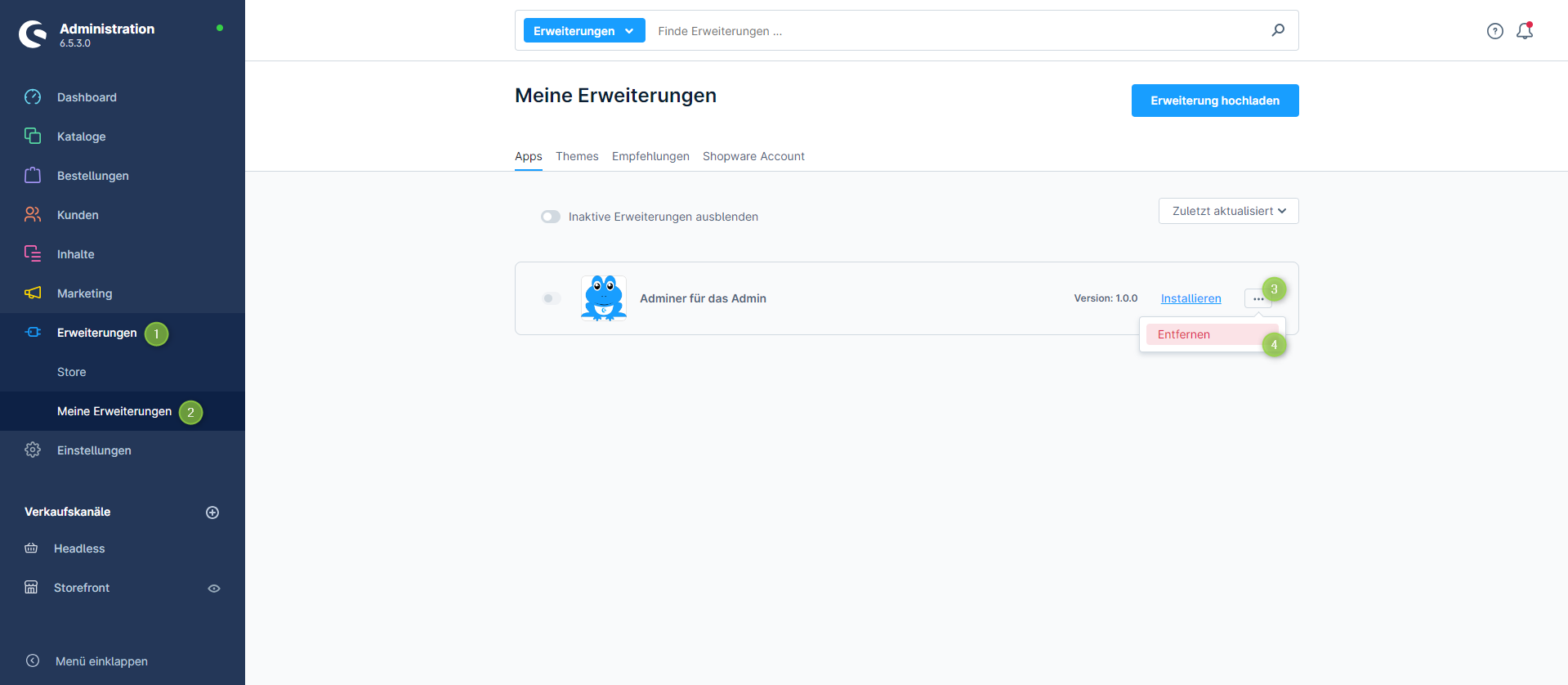 Wechsel über die Hauptnavigation in die "Erweiterungs-Verwaltung" (1) (2) ("Erweiterungen" => "Meine Erweiterungen")